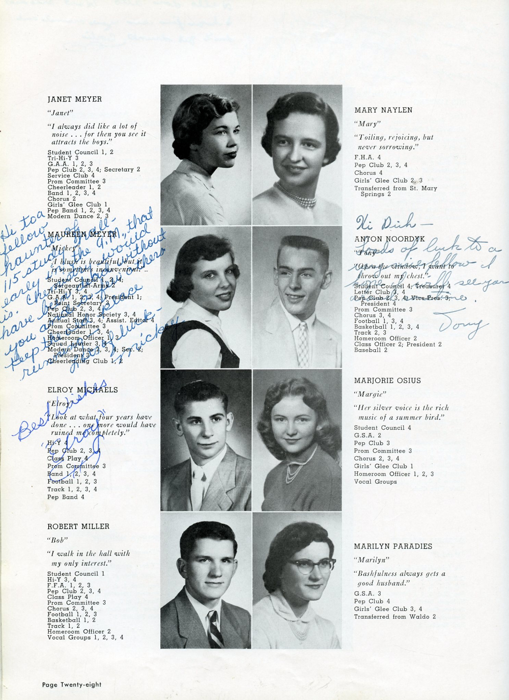 1955 Plymouth High School Yearbook Page 28: Janet Meyer, Maureen Meyer, Elroy Michaels, Robert Miller, Mary Naylen, Anton Noordyk, Marjorie Osius, Marilyn Paradies.