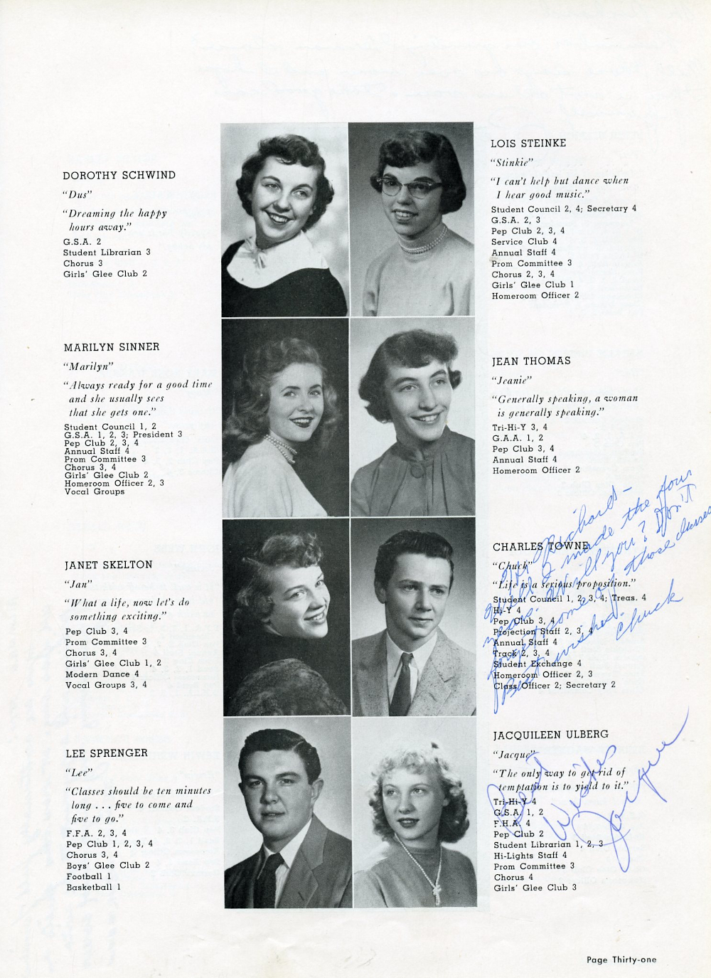 1955 Plymouth High School Yearbook Page 31: Dorothy Schwind, Marilyn Sinner, Janet Skelton, Lee Sprenger, Lois Steinke, Jean Thomas, Charles Towne, Jacquileen Ulberg.