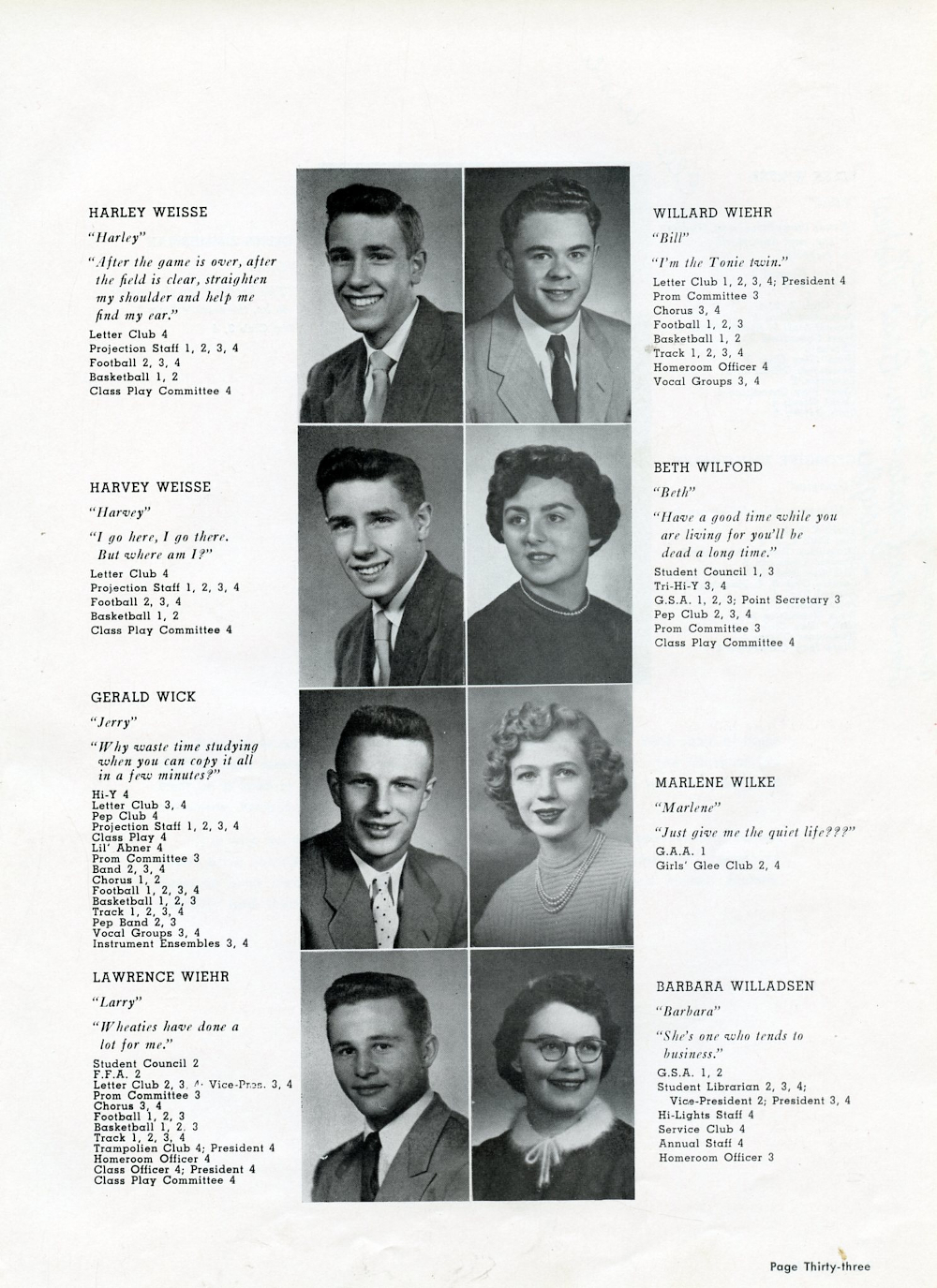 1955 Plymouth High School Yearbook Page 33: Harley Weisse, Harvey Weisse, Gerald Wick, Lawrence Wiehr, Willard Wiehr, Beth Wilford, Marlene Wilke, Barbara Willadsen.