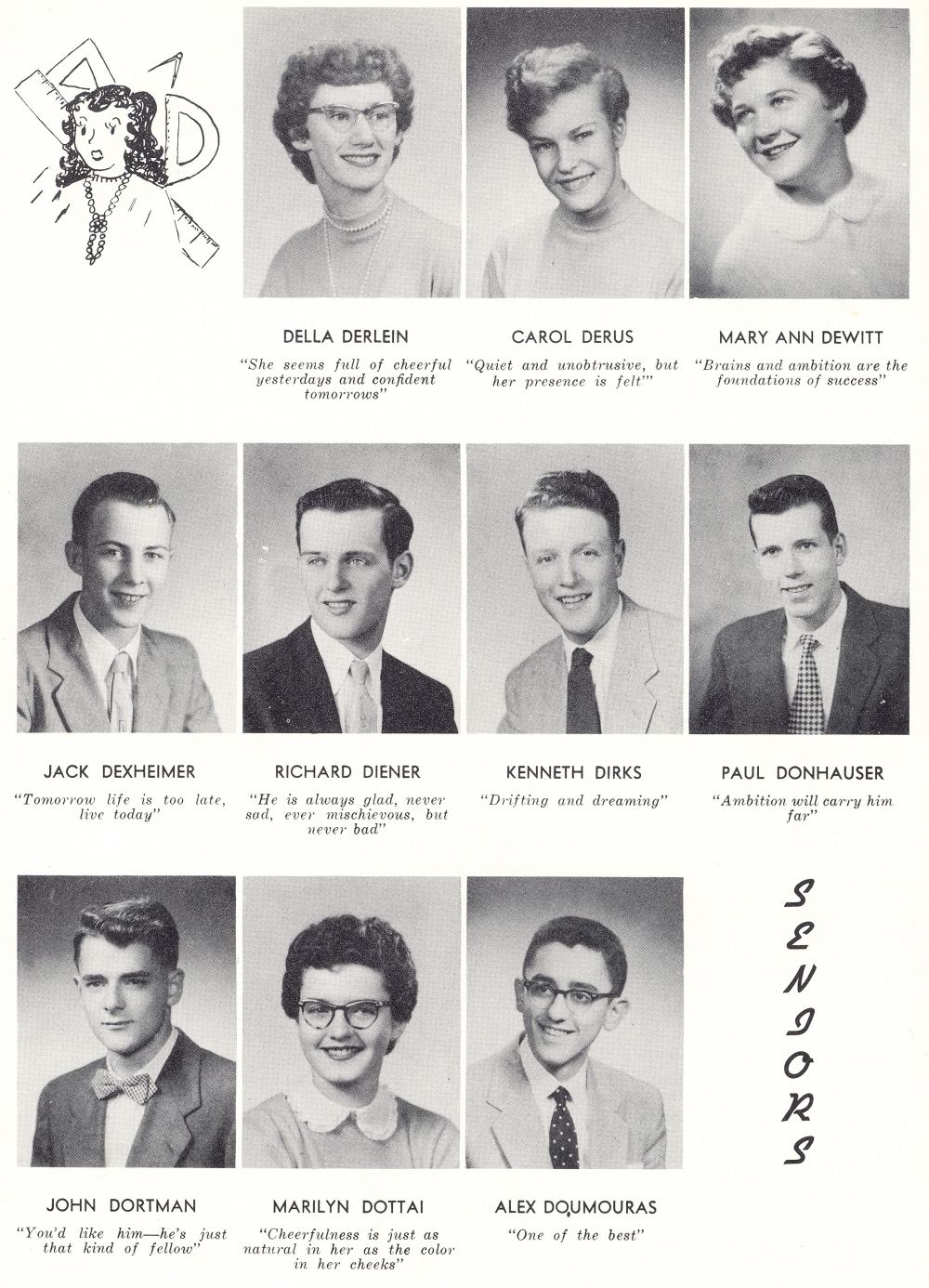 1955 Sheboygan Central High School, Page 28: Della Derlein, Carol Derus, Mary Ann Dewitt, Jack Dexheimer, Richard Diener, Kenneth Dirks, Paul Donhauser, John Dortman, Marilyn Dottai, Alex Doumouras.