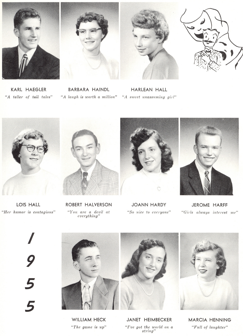 1955 Sheboygan Central High School, Page 35: Karl Haegler, Barbara Haindl, Harlean Hall, Lois Hall, Robert Halverson, Joann Hardy, Jerome Harff, William Heck, Janet Heimbecker, Marcia Henning.