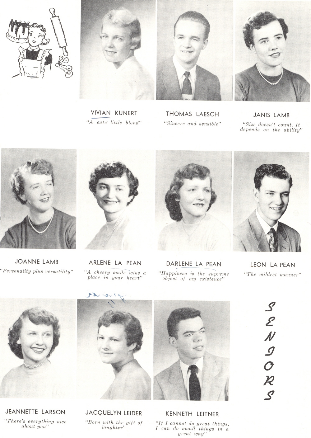 1955 Sheboygan Central High School, Page 42: Vivian Kunert, Thomas Laesch, Janis Lamb, Joanne Lamb, Arlene La Pean, Darlene La Pean, Leon La Pean, Jeanette Larson, Jacquelyn Leider, Kenneth Leitner.