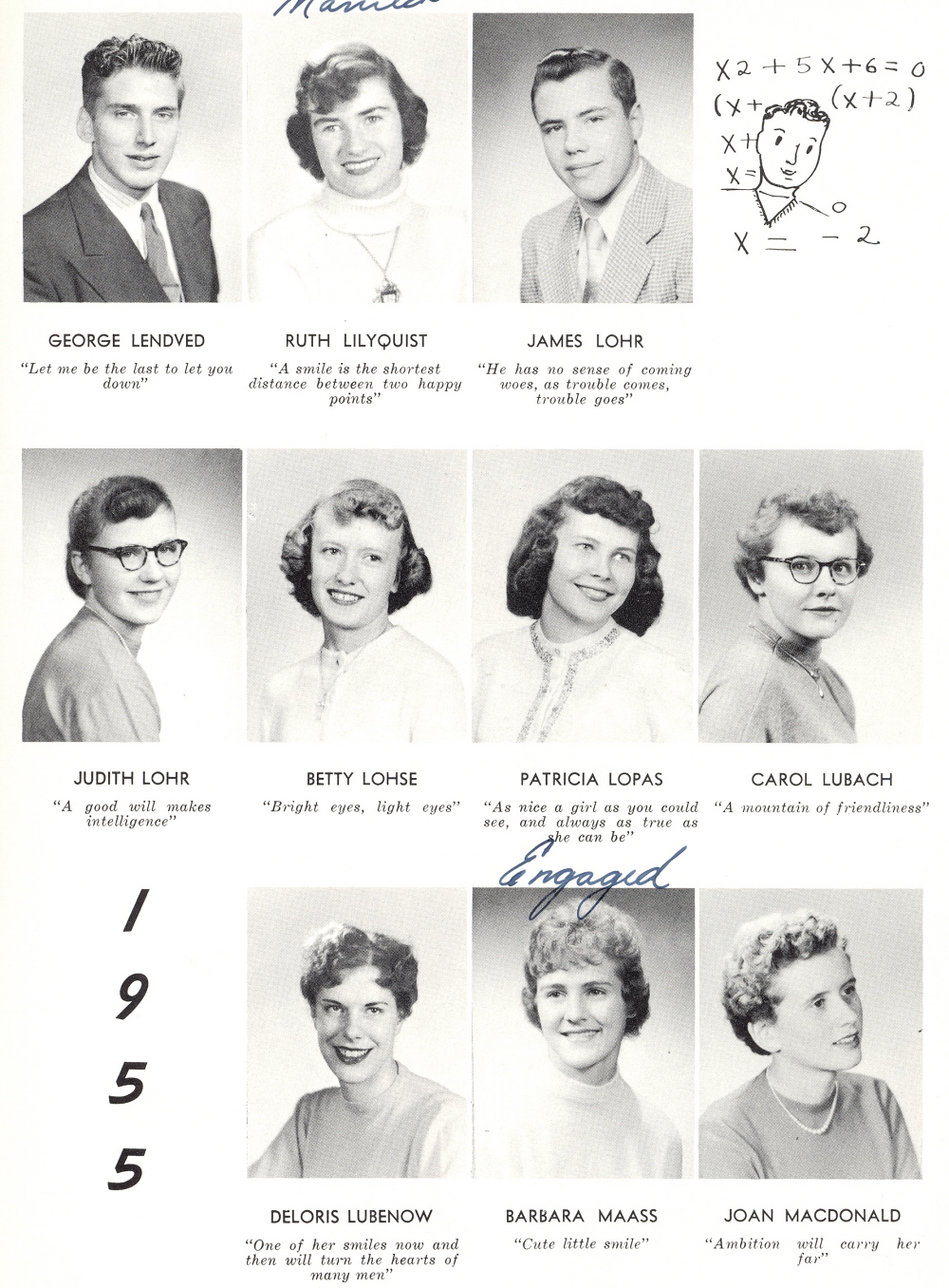 1955 Sheboygan Central High School, Page 43: George Lendved, Ruth Lilyquist, James Lohr, Judith Lohr, Betty Lohse, Patricia Lopas, Carol Lubach, Delores Lubenow, Barbara Maass, Joan MacDonald.
