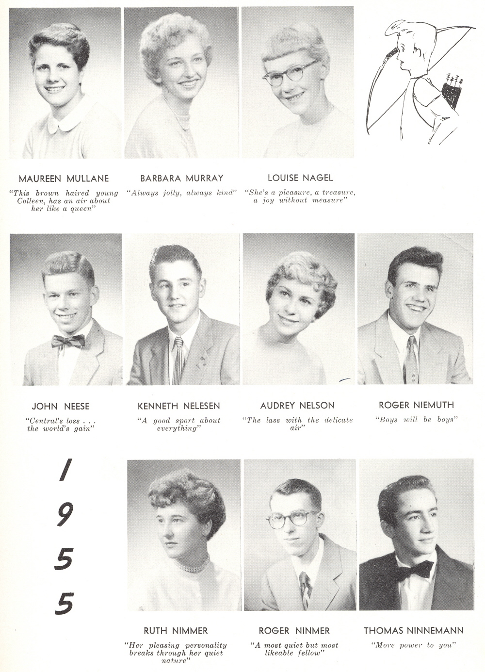 1955 Sheboygan Central High School, Page 47: Maureen Mullane, Barbara Murray, Louise Nagel, John Neese, Kenneth Nelesen, Audrey Nelson, Roger Niemuth, Ruth Nimmer, Roger Ninmer, Thomas Ninnemann.