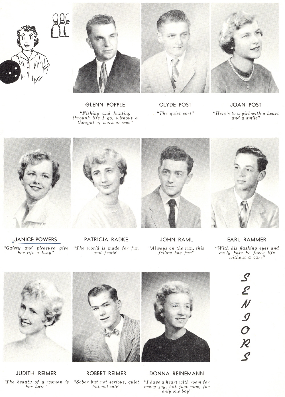1955 Sheboygan Central High School, Page 50: Glenn Popple, Clyde Post, Joan Post, Janice Powers, Patricia Radke, John Raml, Earl Rammer, Judith Reimer, Robert Reimer, Donna Reinemann.