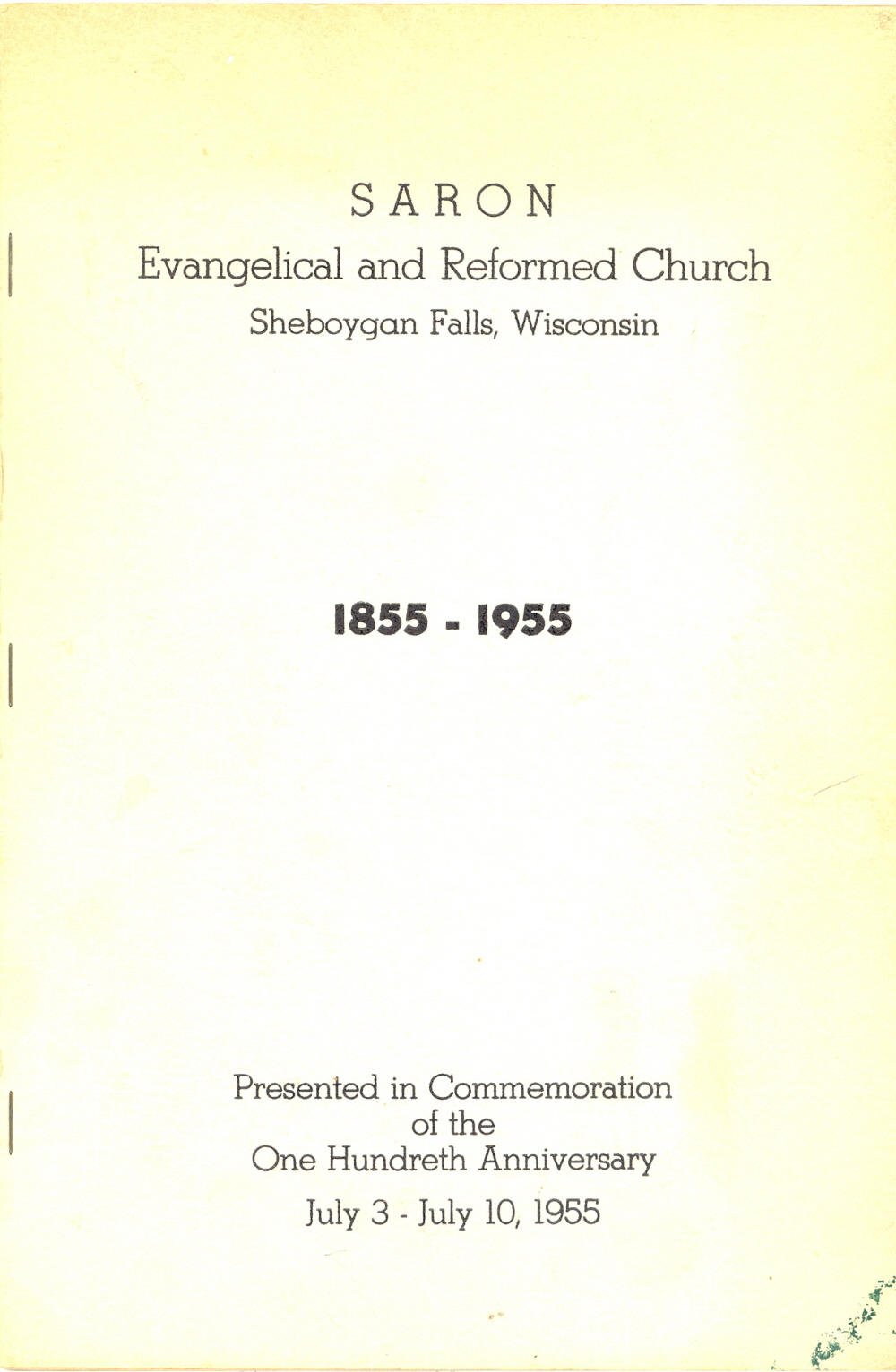 1955 Saron Evangelical and Reformed Church 100th Anniversary: Front Cover.