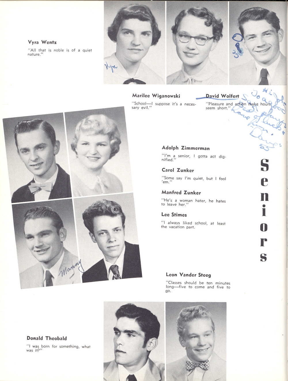 1955 Sheboygan Falls High School, Page 22: Vyra Wentz, Marilee Wiganowski, David Wolfert, Adolph Zimmerman, Carol Zunker, Manfred Zunker, Lee Stimes, Donald Theobald, Leon Vander Steeg.