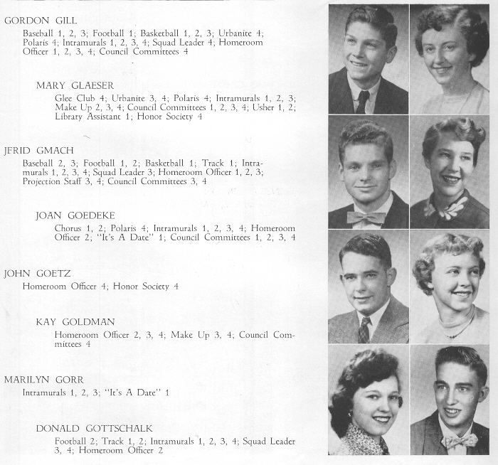 1955 Sheboygan North High School, Page 23: Gordon Gill, Mary Glaeser, Jerid Gmach, Joan Goedeke, John Goetz, Kay Goldman, Marilyn Gorr, Donald Gottschalk.