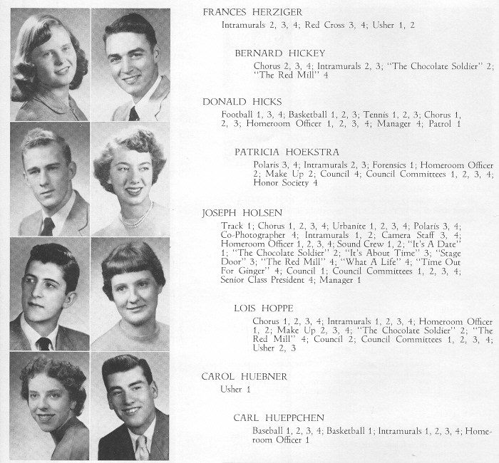 1955 Sheboygan North High School, Page 26: Frances Herziger, Bernard Hickey, Donald Hicks, Patricia Hoekstra, Joseph Holsen, Lois Hoppe, Carol Huebner, Carl Hueppchen.