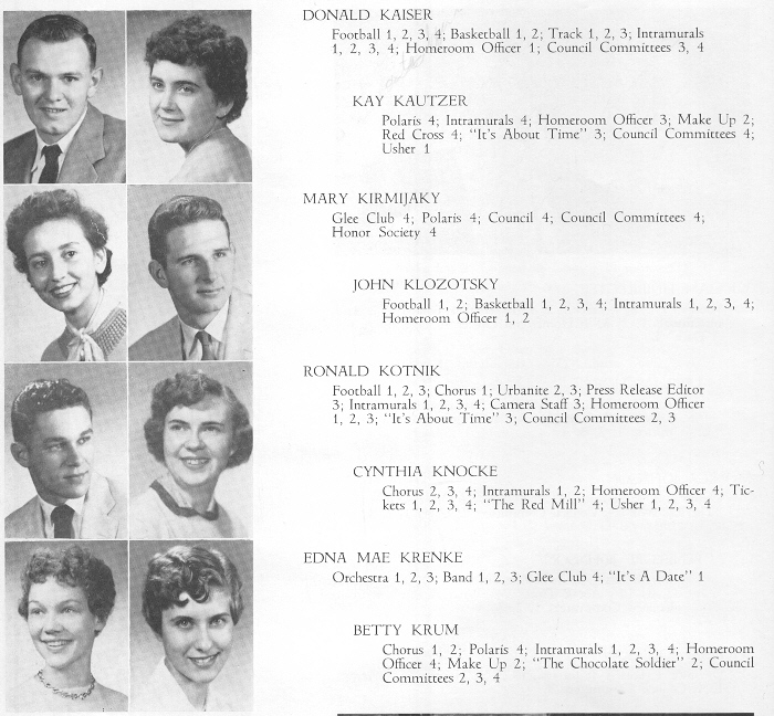 1955 Sheboygan North High School, Page 28: Donald Kaiser, Kay Kautzer, Mary Kirmijaky, John Klozotsky, Ronald Kotnik, Cynthia Knocke, Edna Mae Krenke, Betty Krum.