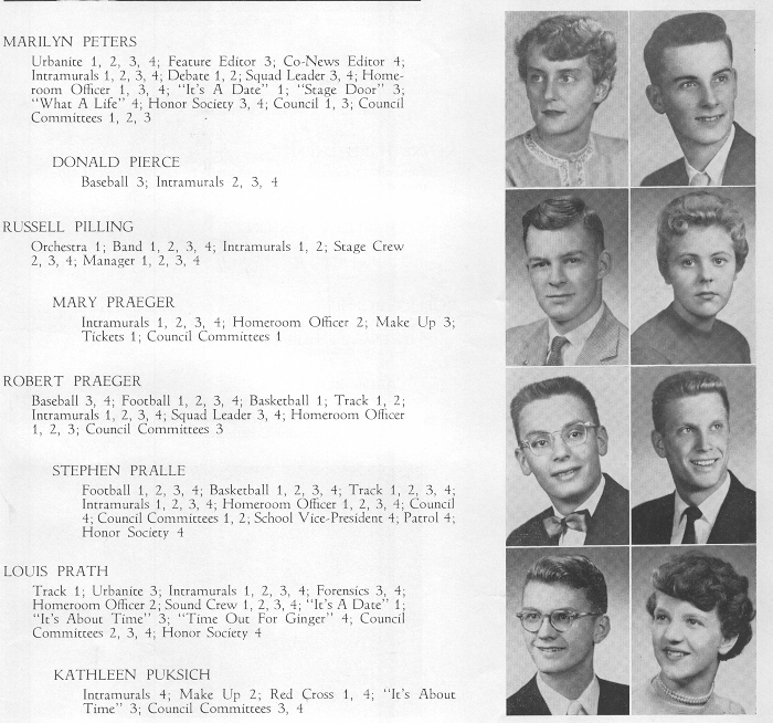 1955 Sheboygan North High School, Page 33: Marilyn Peters, Donald Pierce, Russell Pilling, Mary Praeger, Robert Praeger, Stephen Pralle, Louis Prath, Kathleen Puksich.