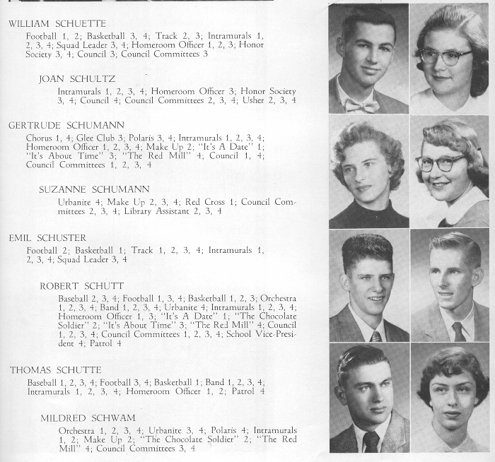 1955 Sheboygan North High School, Page 37: William Schuette, Joan Schultz, Gertrude Schumann, Suzanne Schumann, Emil Schuster, Robert Schutt, Thomas Schutte, Mildred Schwam.