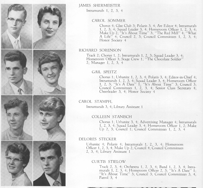 1955 Sheboygan North High School, Page 38: James Shermeister, Carol Sommer, Richard Sorenson, Gail Speitz, Carol Stampfl, Colleen Stanisch, Delores Stecker, Curtis Stielow.