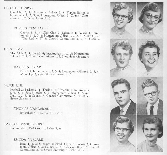 1955 Sheboygan North High School, Page 39: Delores Tenpas, Phyllis Ten Pas, Joan Timm, Barbara Tresp, Bruce Uhl, Thomas Vanderbilt, Darlene Vanderburg, Rhoda Verlare.