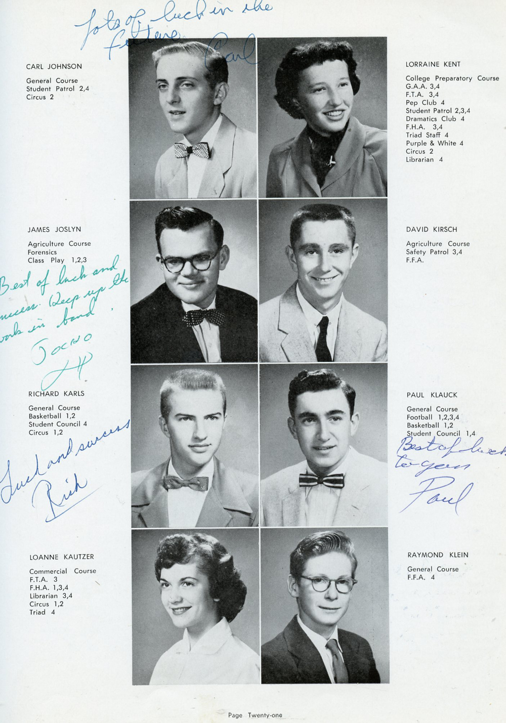 1956 Kiel High School, Page 21: Carl Johnson, James Joslyn, Richard Karls, Loanne Kautzer, Lorraine Kent, David Kirsch, Paul Klauck, Raymond Klein.