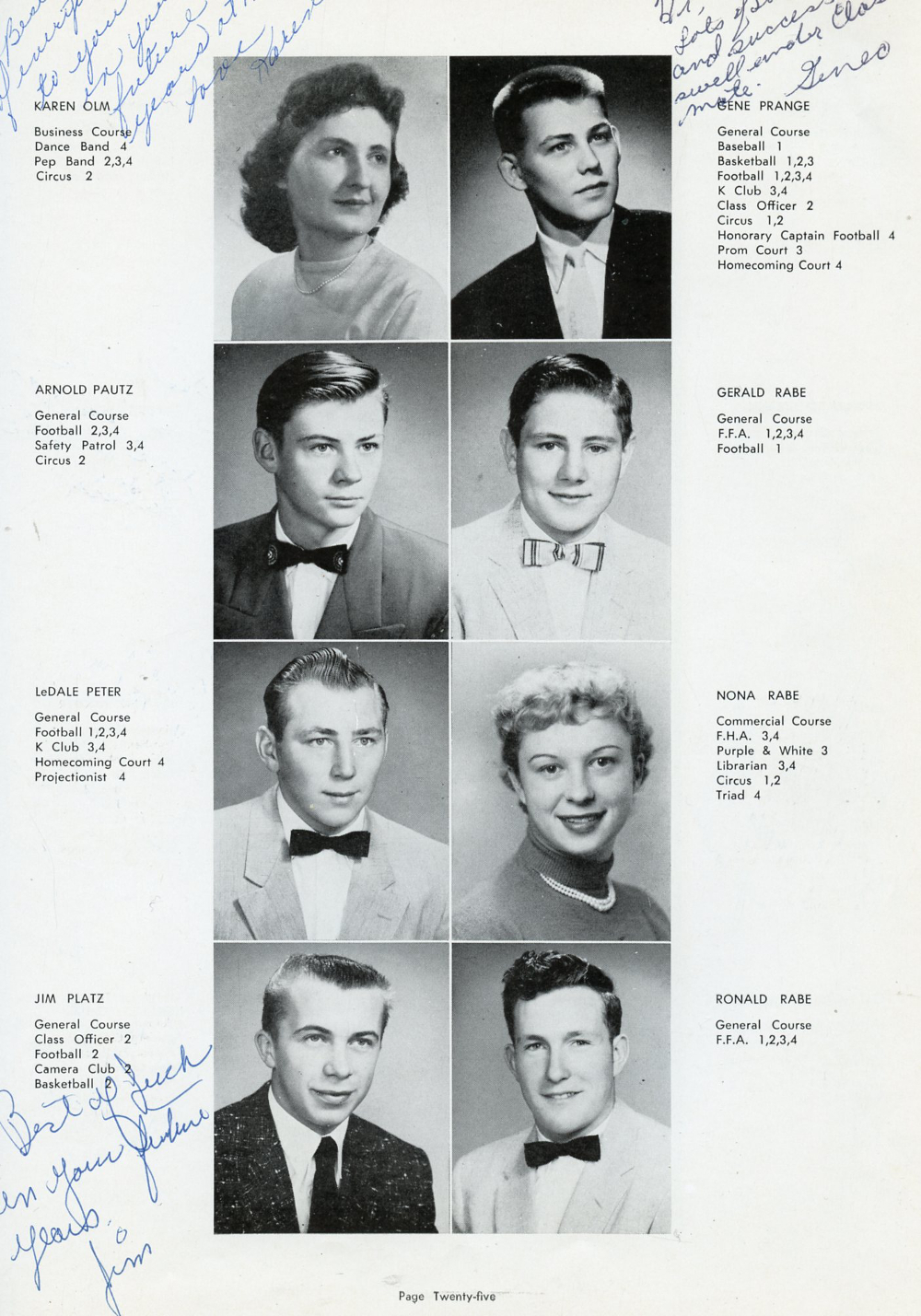 1956 Kiel High School, Page 25: Karen Olm, Arnold Pautz, LeDale Peter, Jim Platz, Gene Prange, Gerald Rabe, Nona Rabe, Ronald Rabe.