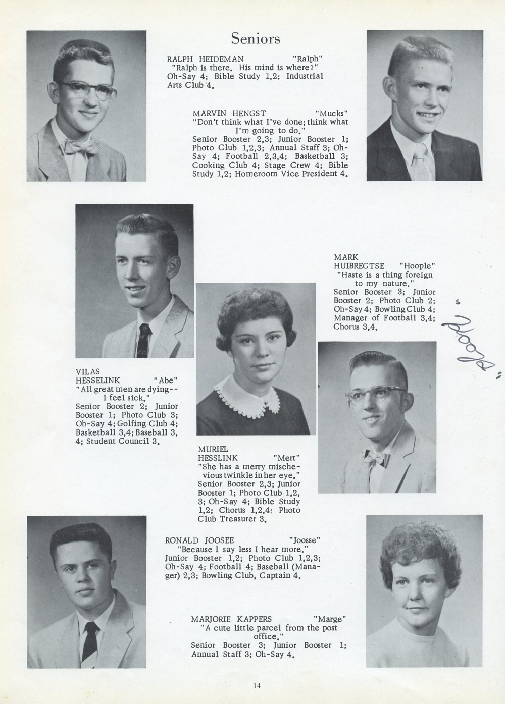 1956 Oostburg High School, Page 14: Ralph Heideman, Marvin Hengst, Vilas Hesselink, Muriel Hesselink, Mark Huibregtse, Ronald Joosee, Marjorie Kappers.