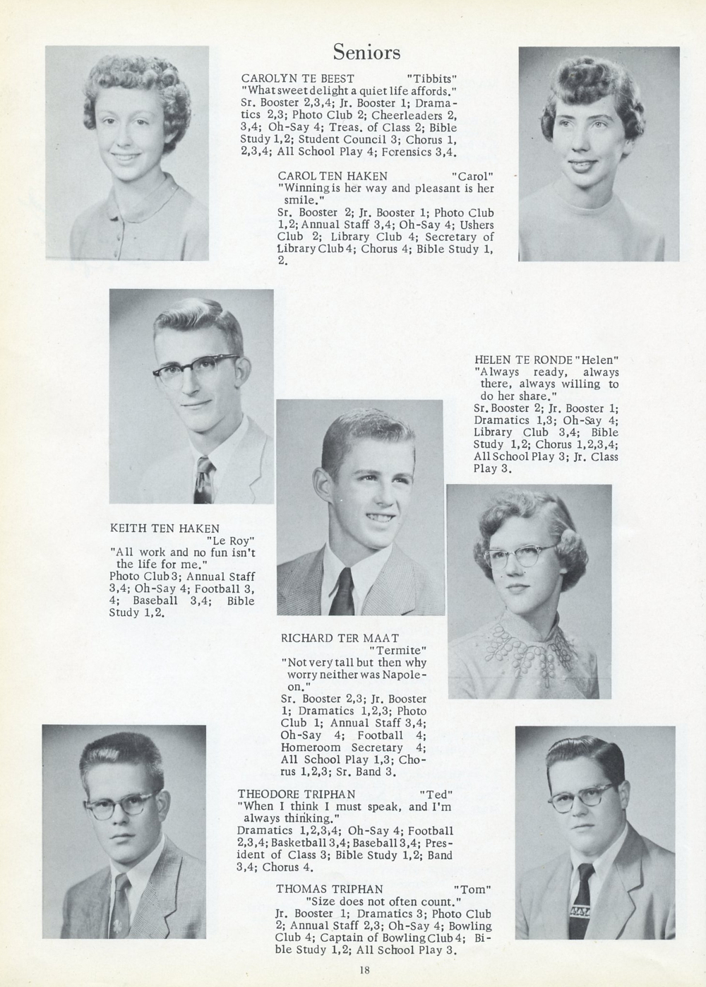 1956 Oostburg High School, Page 18: Carolyn Te Beest, Carol Ten Haken, Keith Ten Haken, Richard Ter Maat, Helen Te Ronde, Theodore Triphan, Thomas Triphan.