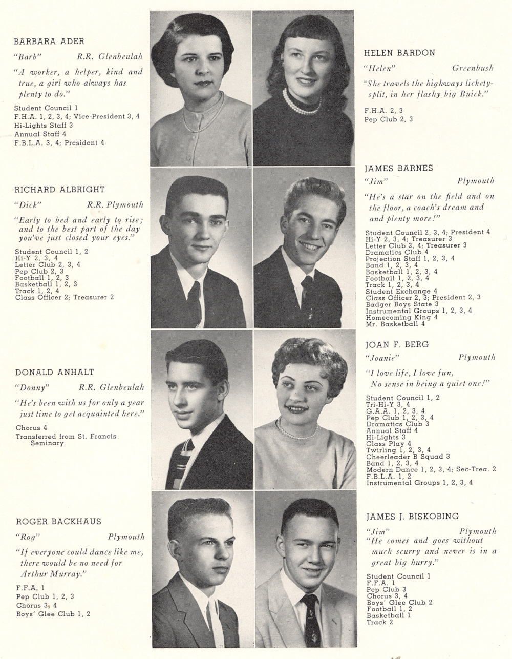 1956 Plymouth High School, Page 20: Barbara Ader, Richard Albright, Donald Anhalt, Roger Backhaus, Helen Bardon, James Barnes, Joan F. Berg, James J. Biskobing.