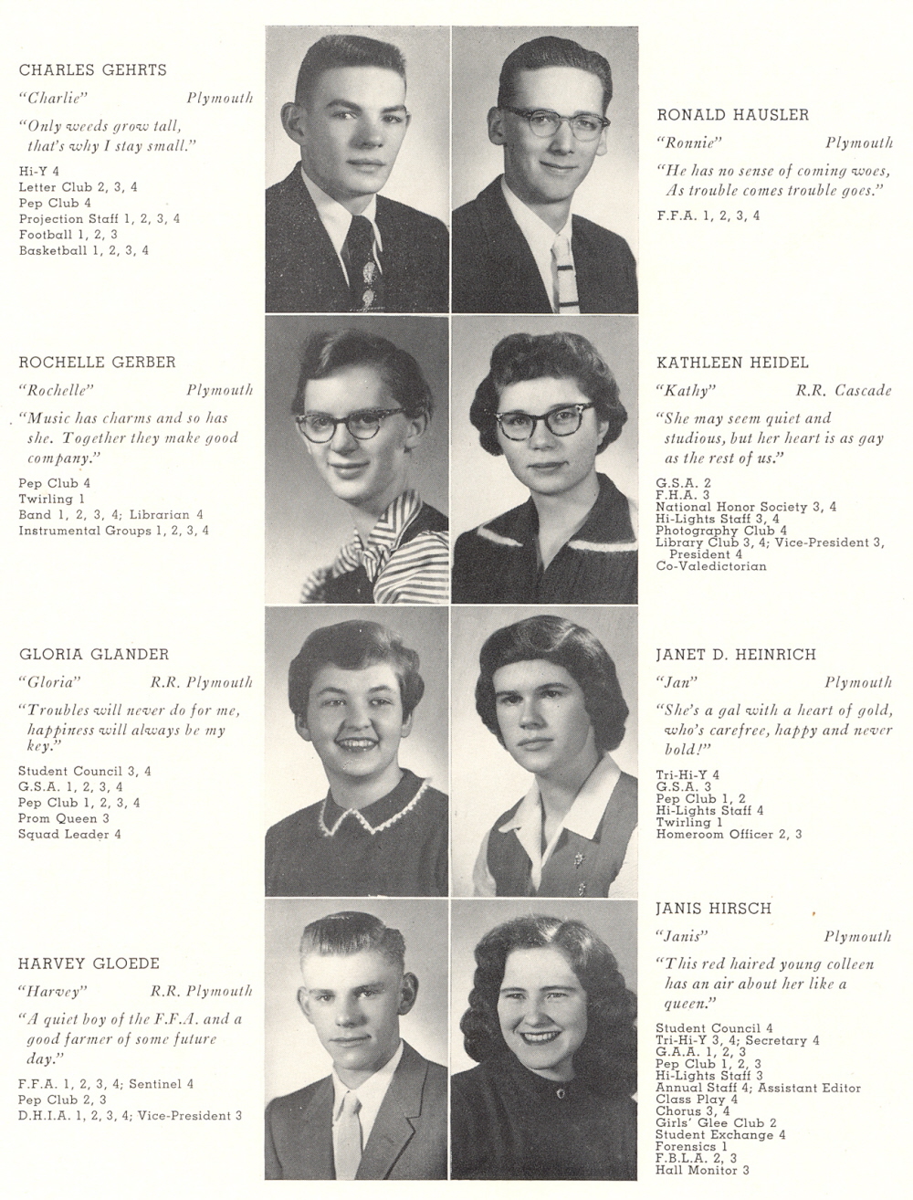 1956 Plymouth High School, Page 23: Charles Gehrts, Rochelle Gerber, Gloria Glander, Harvey Gloede, Ronald Hausler, Kathleen Heidel, Janet D. Heinrich, Janis Hirsch.