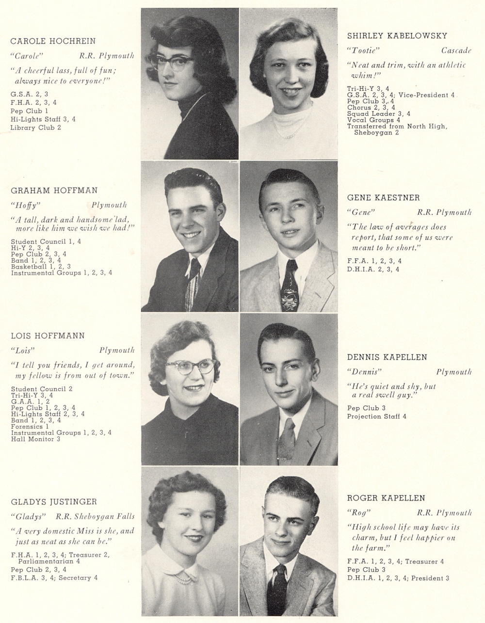 1956 Plymouth High School, Page 24: Carole Hochrein, Graham Hoffman, Lois Hoffmann, Gladys Justinger, Shirley Kabelowsky, Gene Kaestner, Dennis Kapellen, Roger Kapellen.