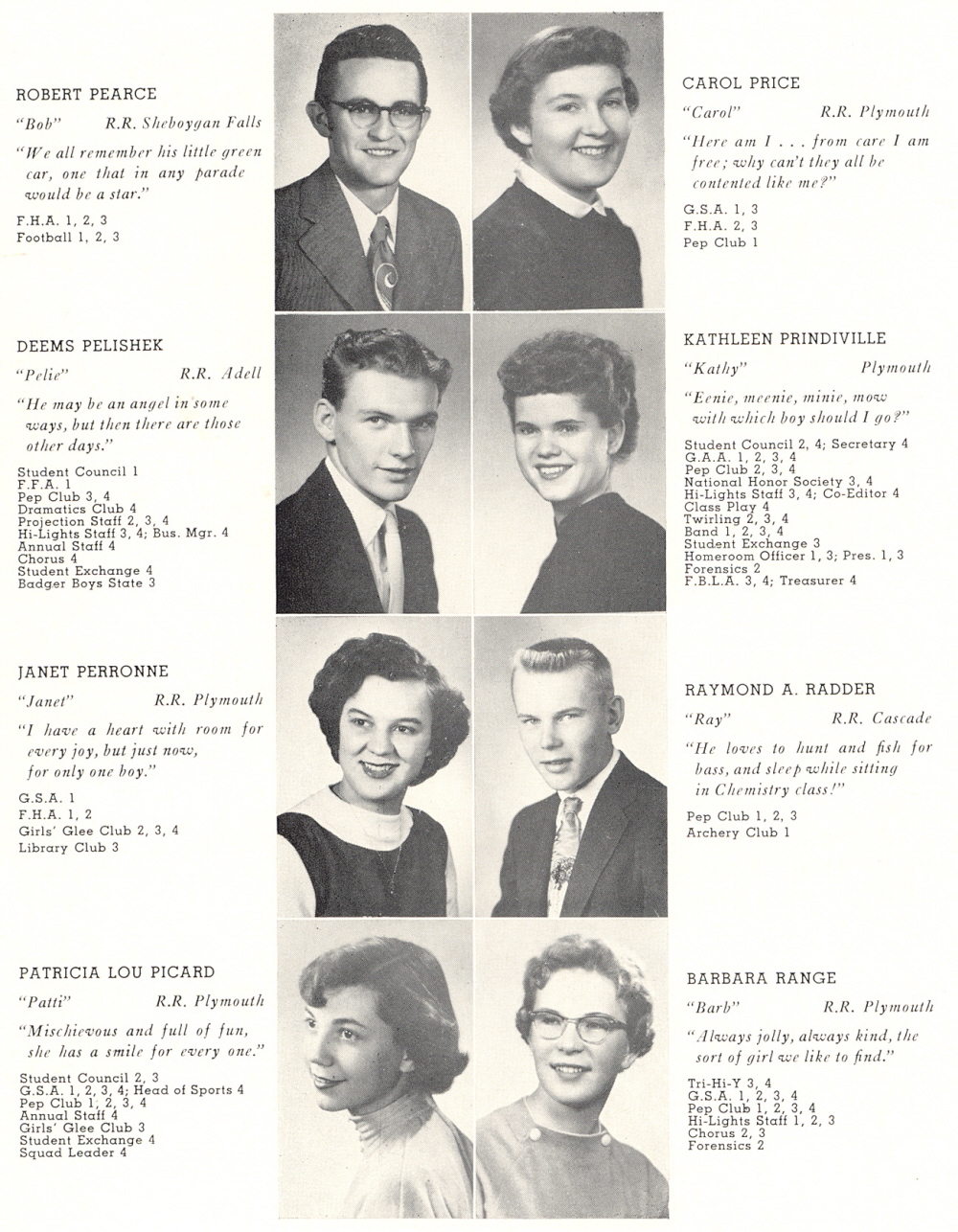 1956 Plymouth High School, Page 28: Robert Pearce, Deems Pelishek, Janet Perronne, Patricia Lou Picard, Carol Price, Kathleen Prindiville, Raymond A. Radder, Barbara Range.