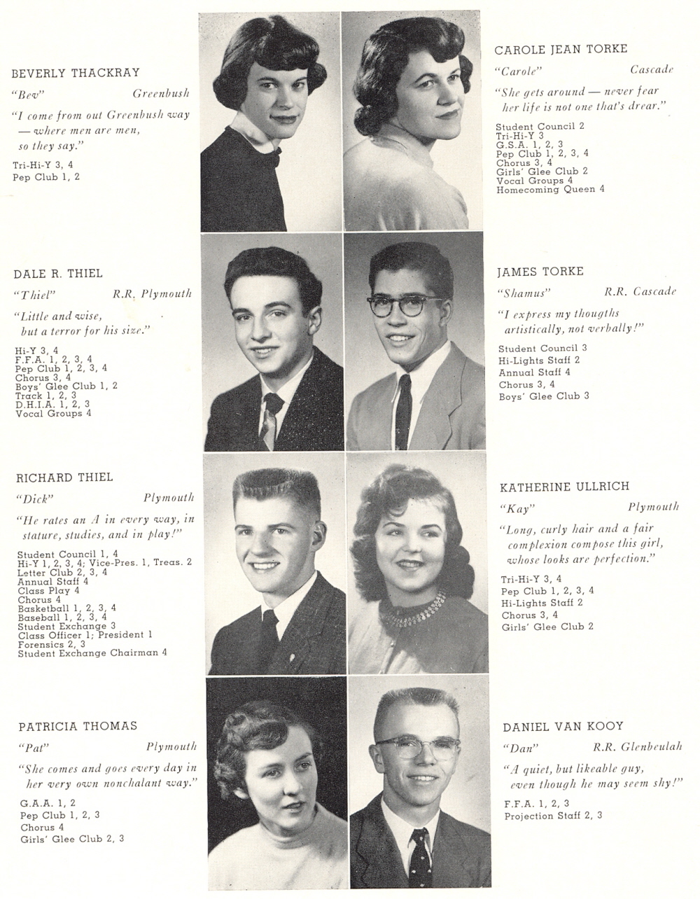 1956 Plymouth High School, Page 32: Beverly Thackray, Dale R. Thiel, Richard Thiel, Patricia Thomas, Carole Jean Torke, James Torke, Katherine Ullrich, Daniel Van Kooy.