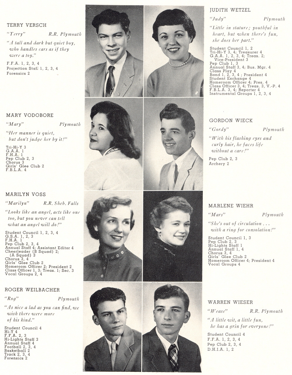 1956 Plymouth High School, Page 33: Terry Versch, Mary Vodobore, Marilyn Voss, Roger Weilbacher, Judith Wetzel, Gordon Wieck, Marlene Wiehr, Warren Wieser.