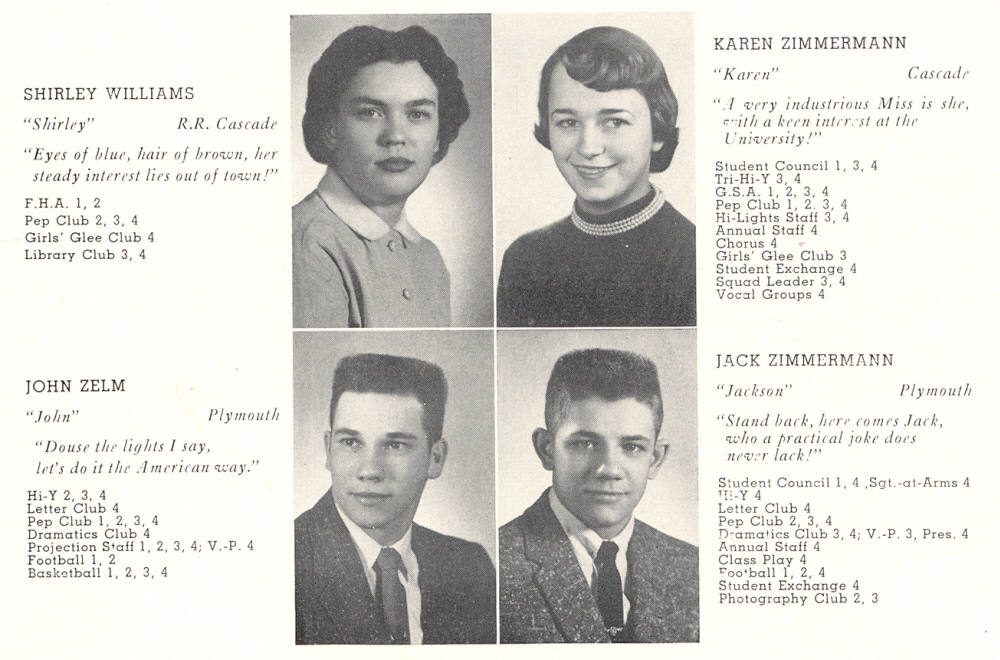 1956 Plymouth High School, Page 34: Shirley Williams, John Zelm, Karen Zimmermann, Jack Zimmermann.