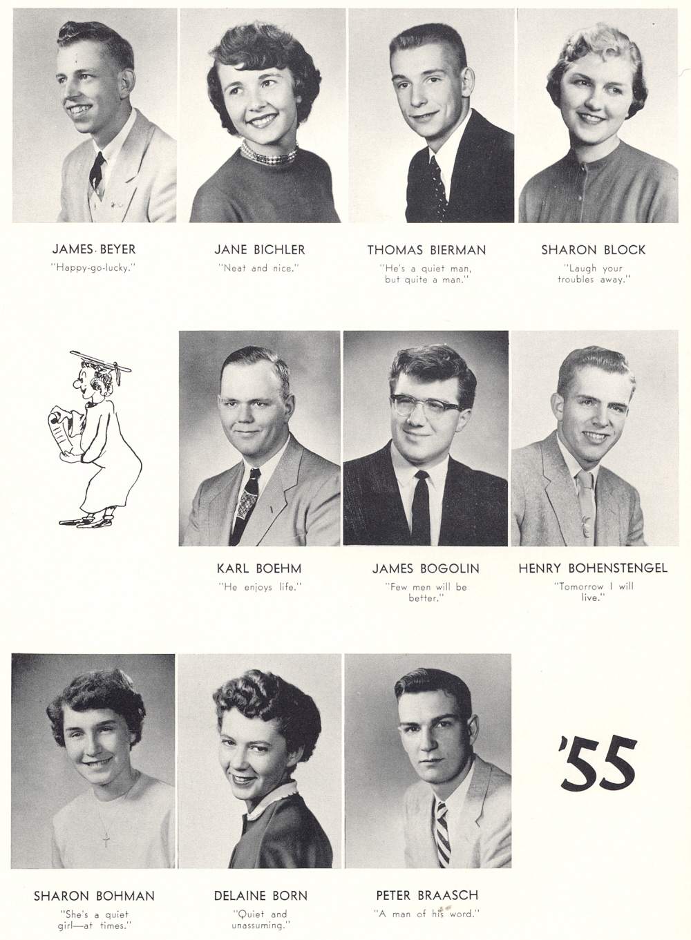 1956 Sheboygan Central High School, Page 24: James Beyer, Jane Bichler, Thomas Bierman, Sharon Block, Karl Boehm, James Bobolin, Henry Bohenstengel, Sharon Bohman, Delaine Born, Peter Braasch.