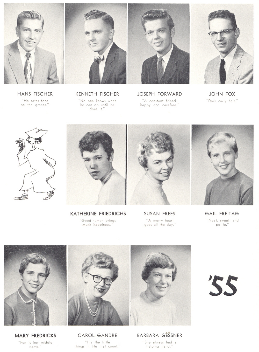 1956 Sheboygan Central High School, Page 30: Hans Fischer, Kenneth Fischer, Joseph Forward, John Fox, Katherine Friedrichs, Susan Frees, Gail Freitag, Mary Fredricks, Carol Gandre, Barbara Gessner.