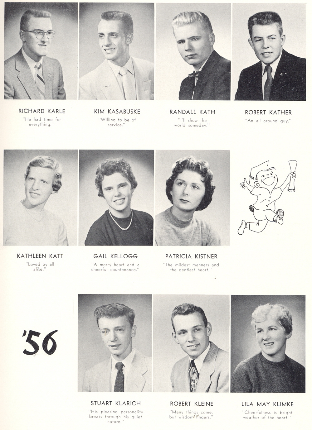 1956 Sheboygan Central High School, Page 37: Richard Karle, Kim Kasabuske, Randall Kath, Robert Kather, Kathleen Katt, Gail Kellogg, Patricia Kistner, Stuart Klarich, Robert Kleine, Lila May Klimke.