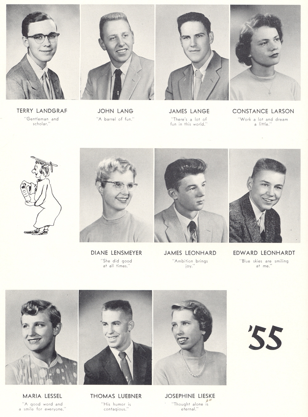 1956 Sheboygan Central High School, Page 40: Terry Landgraf, John Lang, James Lange, Constance Larson, Diane Lensmeyer, James Leonhard, Edward Leonhardt, Maria Lessel, Thomas Luebner, Josephine Lieske.