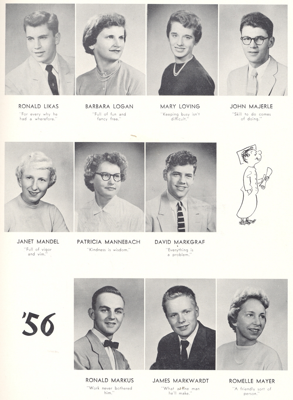1956 Sheboygan Central High School, Page 41: Ronald Likas, Barbara Logan, Mary Loving, John Majerle, Janet Mandel, Patricia Mannebach, David Markgraf, Ronald Markus, James Markwardt, Romelle Mayer.