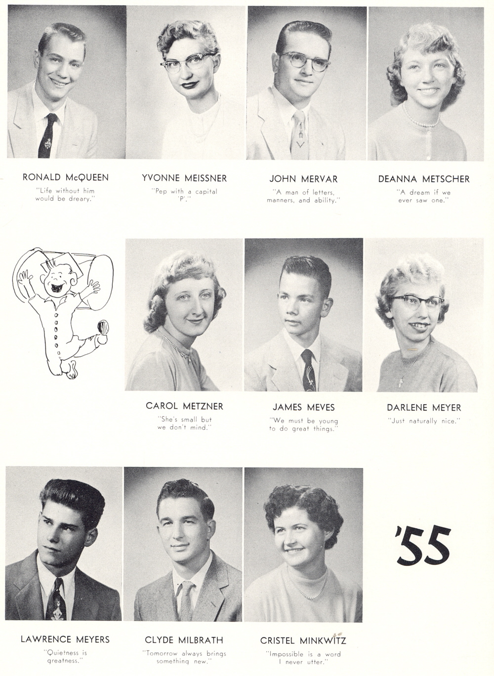 1956 Sheboygan Central High School, Page 42: Ronald McQueen, Yvonne Meissner, John Mervar, Deanna Metscher, Carol Metzner, James Meves, Darlene Meyer, Lawrence Meyers, Clyde Milbrath, Cristel Minkwitz.