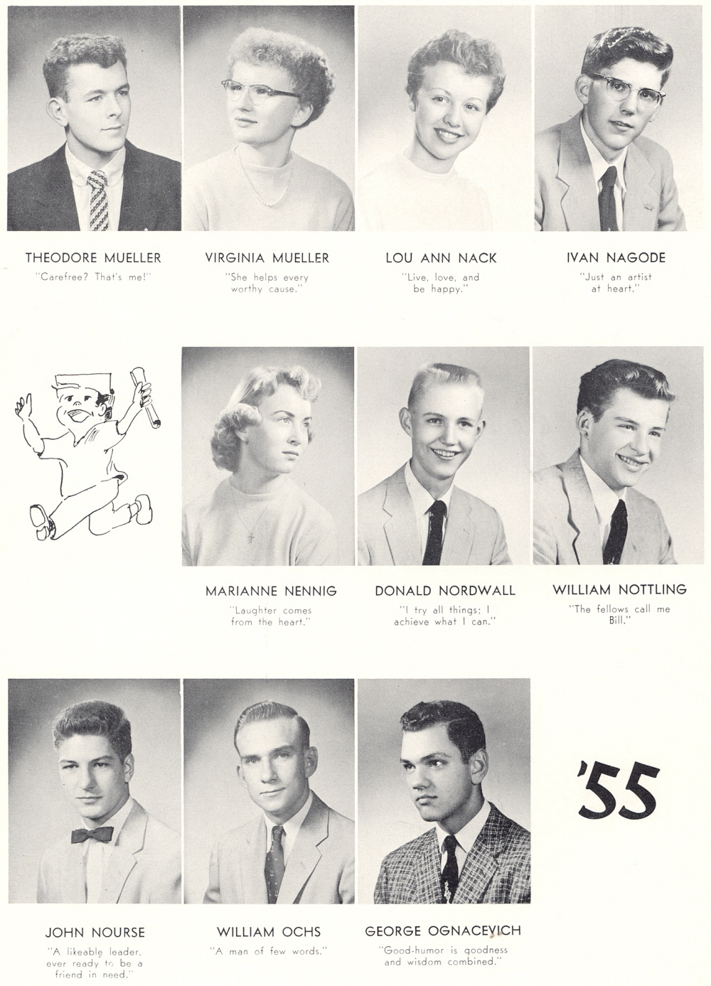 1956 Sheboygan Central High School, Page 44: Theodore Mueller, Virginia Mueller, Lou Ann Nack, Ivan Nagode, Marianne Nennig, Donald Nordwall, William Nottling, John Nourse, William Ochs, George Ognacevich.