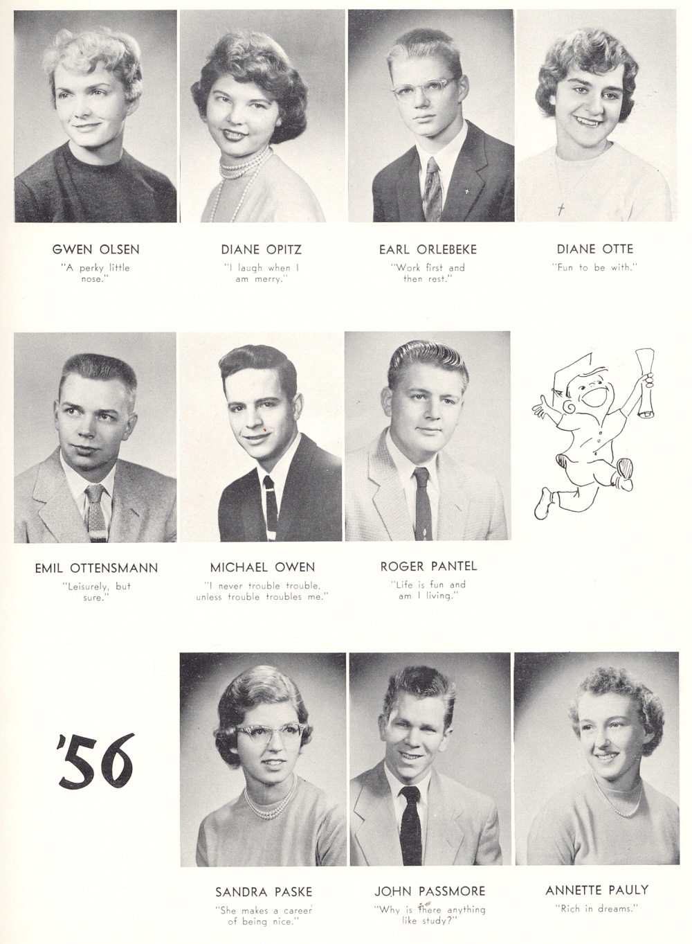 1956 Sheboygan Central High School, Page 45: Gwen Olsen, Diane Opitz, Earl Orlebeke, Diane Otte, Emil Ottensmann, Michael Owen, Roger Pantel, Sandra Paske, John Passmore, Annette Pauly.