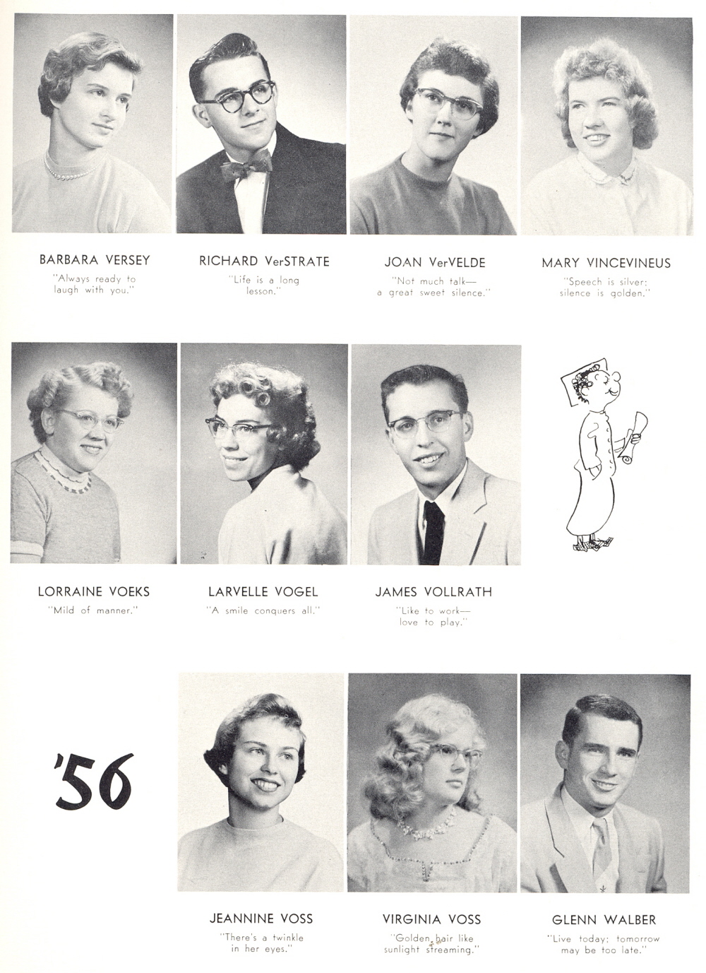 1956 Sheboygan Central High School, Page 57: Barbara Versey, Richard VerStrate, Joan VerVelde, Mary Vincevineus, Lorraine Voeks, Larvelle Vogel, James Vollrath, Jeannine Voss, Virginia Voss, Glenn Walber.