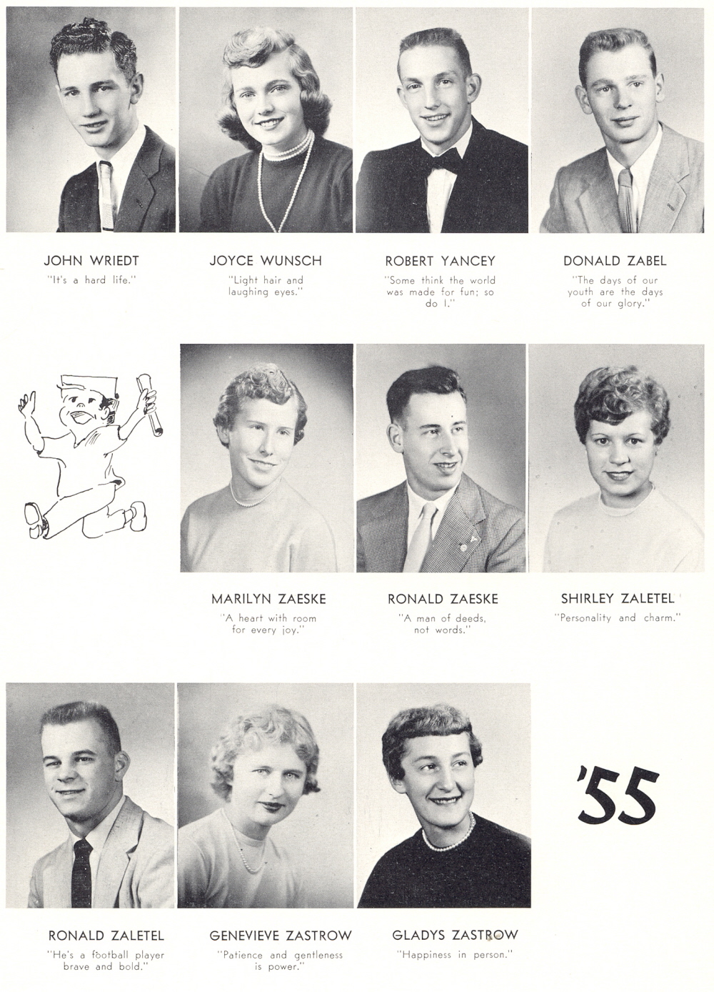 1956 Sheboygan Central High School, Page 60: John Wriedt, Joyce Wunsch, Robert Yancey, Donald Zabel, Marilyn Zaeske, Ronald Zaeske, Shirley Zaletel, Ronald Zaletel, Genevieve Zastrow, Gladys Zastrow.