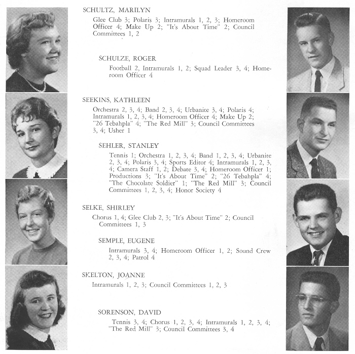 1956 Sheboygan North High School, Page 100: Marilyn Schultz, Roger Schulze, Kathleen Seekins, Stanley Sehler, Shirley Selke, Eugene Semple, Joanne Skelton, David Sorenson.