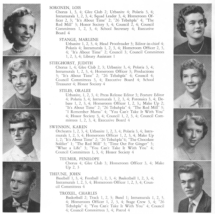 1956 Sheboygan North High School, Page 101: Lois Soronen, Marlene Stange, Judith Steighorst, Oralee Stiles, Karen Swenson, Penelope Teumer, John Theune, Charles Troxel.