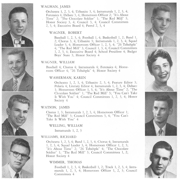 1956 Sheboygan North High School, Page 103: James Wagman, Robert Wagner, William Wagner, Karen Wasserman, James Watson, William Welling, Richard Williams, Thomas Wimmer.