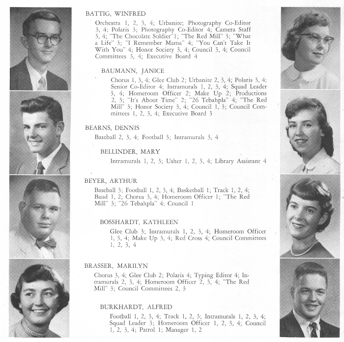 1956 Sheboygan North High School, Page 81: Winfred Battig, Janice Baumann, Dennis Bearns, Mary Bellinder, Arthur Beyer, Kathleen Bosshardt, Marilyn Brasser, Alfred Burkhardt.