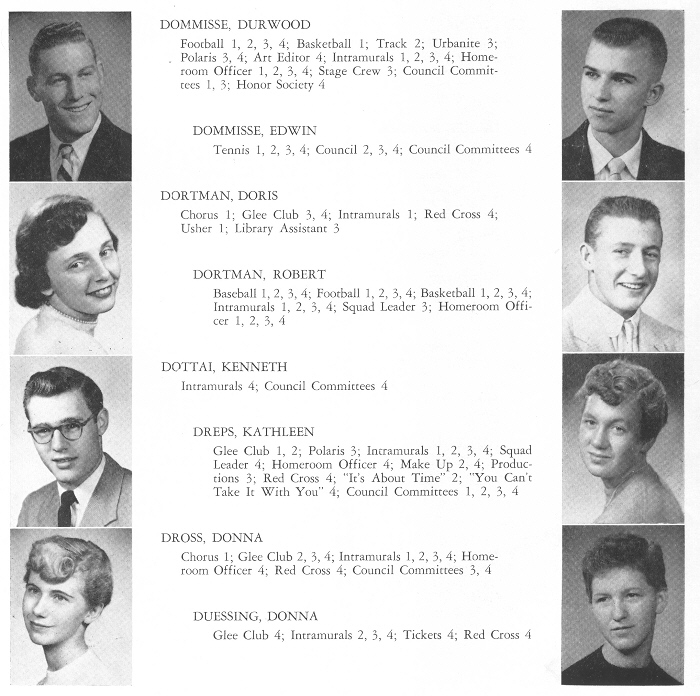 1956 Sheboygan North High School, Page 83: Durwood Dommisse, Edwin Dommisse, Doris Dortman, Robert Dortman, Kenneth Dottai, Kathleen Dreps, Donna Dross, Donna Duessing.