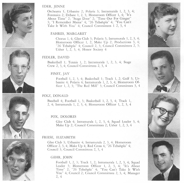 1956 Sheboygan North High School, Page 84: Jenne Eder, Margaret Fahres, David Fedler, Jay Finst, Donald Folz, Dolores Fox, Elizabeth Friese, John Gehr.