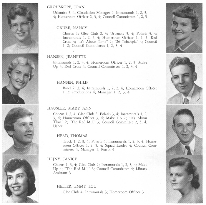 1956 Sheboygan North High School, Page 86: Joan Grohskopf, Nancy Grube, Jeanette Hansen, Philip Hansen, Mary Ann Hauser, Thomas Head, Janice Hejny, Emmy Lou Heller.
