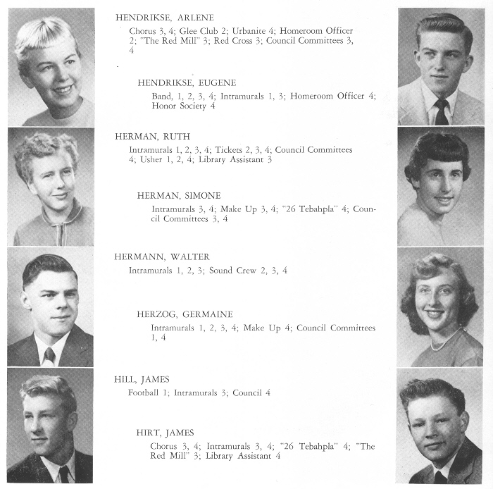 1956 Sheboygan North High School, Page 87: Arlene Hendrikse, Eugene Hendrikse, Ruth Herman, Simone Herman, Walter Hermann, Germaine Herzog, James Hill, James Hirt.