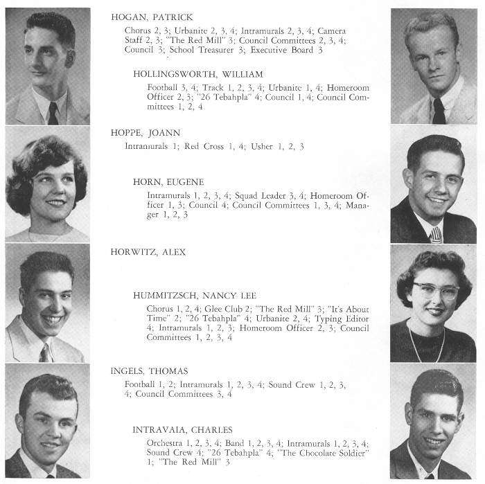 1956 Sheboygan North High School, Page 88: Patrick Hogan, William Hollingsworth, Joann Hoppe, Eugene Horn, Alex Horwitz, Nancy Lee Hummitzsch, Thomas Ingels, Charles Intravaia.