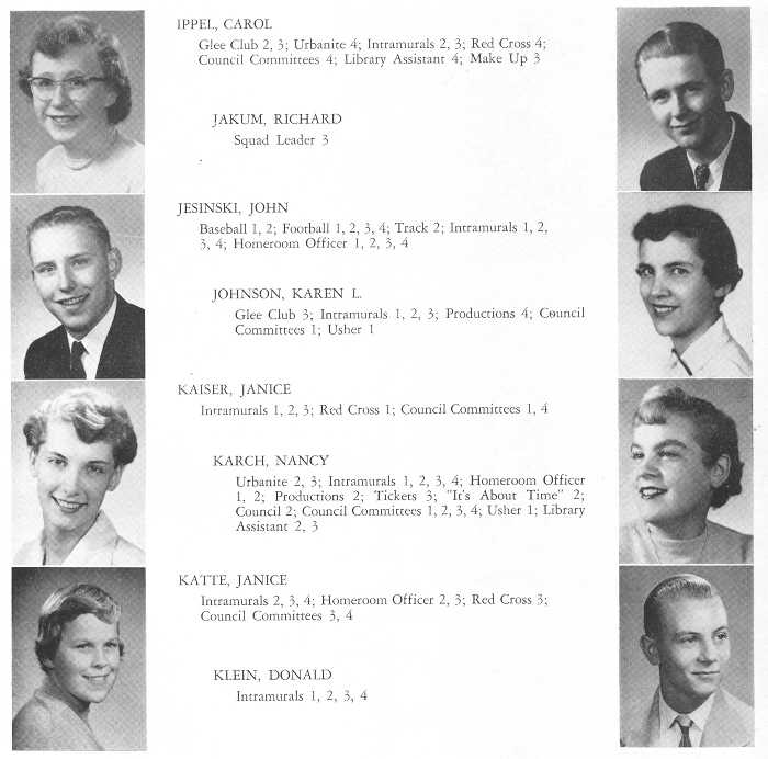 1956 Sheboygan North High School, Page 89: Carol Ippel, Richard Jakum, John Jesinski, Karen Johnson, Janice Kaiser, Nancy Karch, Janice Katte, Donald Klein.