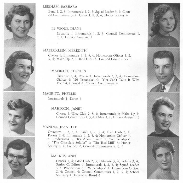 1956 Sheboygan North High School, Page 92: Barbara Leibham, Diane Le Veque, Meredith Maercklein, Stephen Maersch, Phyllis Magritz, Janet Mahloch, Jeanette Mandel, Ann Markus.